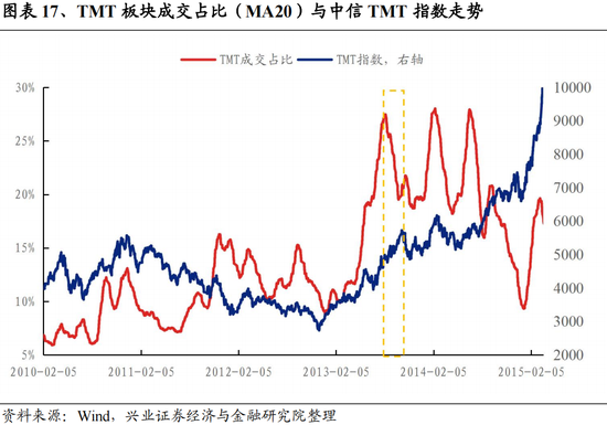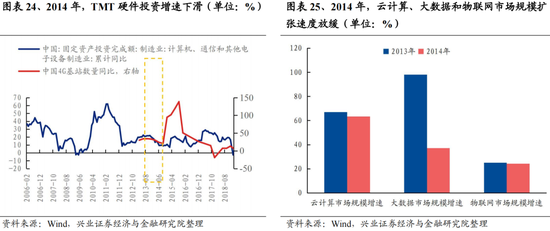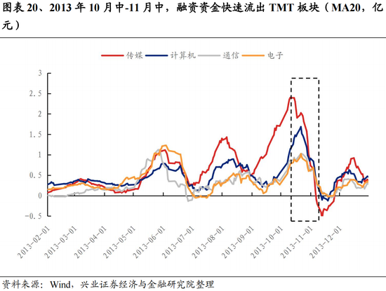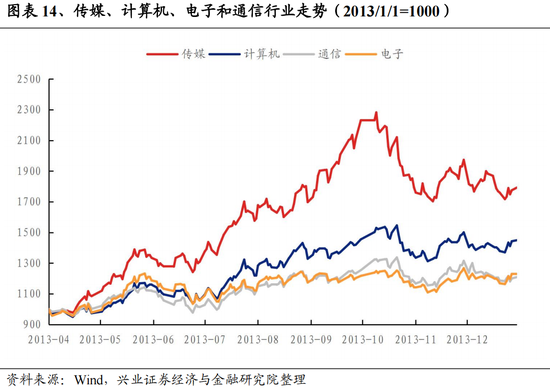 (3)阶段3(2013/10/9-2013/12/23):绝对/超额收益为-10.9%/-5.3%。随着涨幅过高,且估值达到历史高位,叠加部分企业业绩不达预期,市场“人心思动”,各类“鬼故事”丛生,资金获利了结情绪加重,拖累TMT板块于10月初至年底走弱;