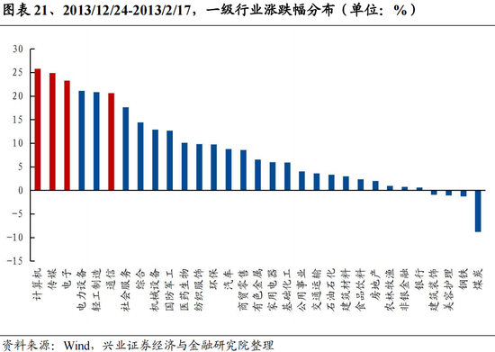 由于彼时处于数据真空期,在政策刺激和险资“开闸”带来的增量资金的催化下,TMT板块再一次开启上涨行情。2013.12.24-2014.2.10,计算机、传媒、电子和通信区间涨幅为25.81%、24.88%、23.26%、20.60%,再度领涨A股。分行业来看,TMT各行业走势较为接近。