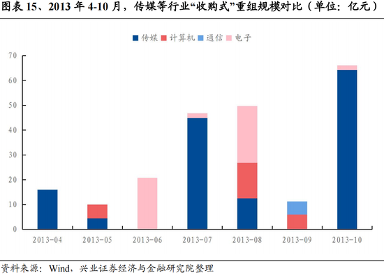 与此同时,并购重组事件为传媒等成长行业提供外延式利润增长。2013年4月以来,A股市场中的定增重组事件数量和交易规模快速攀升,而并购重组带来的外延式利润增长则催化股价进一步走高。