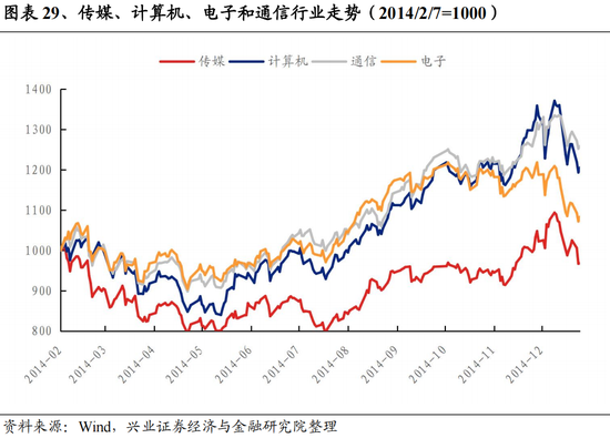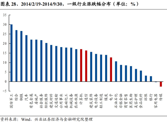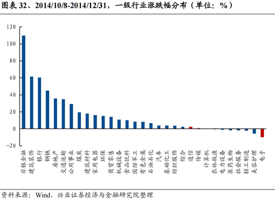 超预期的降息、房市企稳和大放异彩的三季报推动行情主线逐步转向金融、地产链、基建链。2014.10.8-2014.12.31,金融地产板块全面上涨,带动大盘指数快速抬升,其中非银金融涨超110%,银行也大涨超60%,而通信、传媒和计算机涨幅仅为2.3%、0.9%、0.5%,电子行业更是成为同期为数不多下跌的板块。