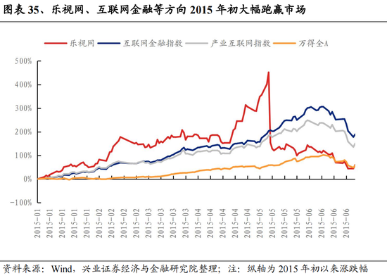 (7)阶段7(2015/1/1-2015/6/12):绝对/超额收益为161.9%/59.7%。李克强总理提出的万物互联打开市场想象空间,围绕“互联网+”的各类主题概念丛生,叠加两融资金大幅入市,推动TMT板块引领A股走出“杠杆牛”。