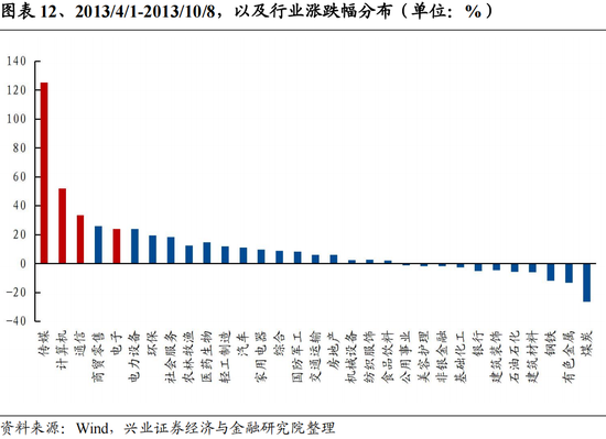 分行业来看,4月-10月的行情中,TMT内部有所分化,传媒率先上涨且弹性较大,计算机次之,通信和电子相对靠后。本轮行情伊始,传媒行业领涨。进入6月份后,A股遭遇“钱荒”,传媒回撤较小,通信和计算机跌幅在9%左右,而电子下跌超13%。7月-9月,中报验证高景气,驱动传媒再次率先大幅上涨,计算机紧随其后、通信和电子弹性较小。我们认为两方面因素使传媒显著跑赢:(1)由于手游和电影票房的高频数据可得性和及时性更强,市场更容易确认传媒行业的高景气(3月底开始,分析师大幅上调传媒2013年盈利预测);(2)传媒板块中并购事件更多,对板块情绪的提振作用更明显。
