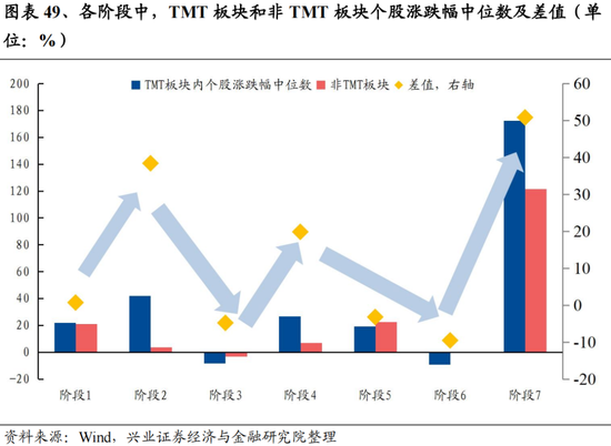 (2)阶段2(2013/2/1-2013/10/8):绝对/超额收益为60.0%/56.4%。13年2-3月,在各项扶持政策频出的背景下,叠加估值处于低位,TMT板块开启第一轮“拔估值”式上涨,进入二季度后,随着数据验证高景气,TMT板块迎来“戴维斯双击”;