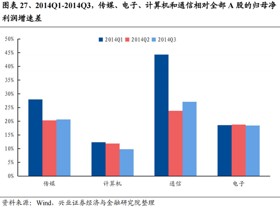 2014年的一季报和中报进一步确认了TMT板块的业绩增速先后开始见顶回落的趋势,此外,除电子行业外,计算机、通信和传媒行业较全部A股的景气优势也逐渐开始收敛。