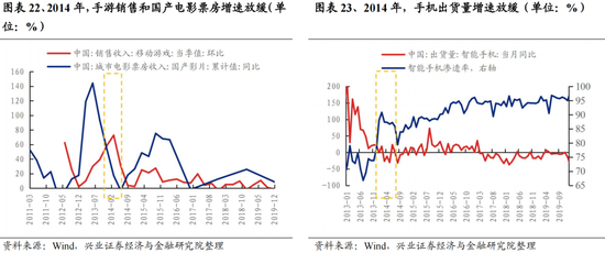 (1)传媒方面,国产电影票房和手游收入增速分别于2014年一二季度见顶后开始回落,2014Q1-2014Q3,移动游戏销售收入环比由72.7%下滑至3.8%;