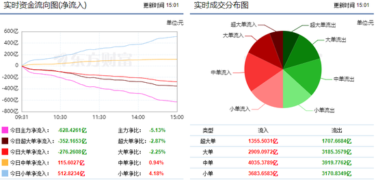 从两市主力资金流向来看,截止收盘,沪深两市主力资金呈现大幅净流出状态,两市共流出628.4261亿元。其中,超大单净流出352.1653亿元,大单净流出276.2608亿,中单净流入115.6027亿元,小单净流入512.8234亿元。