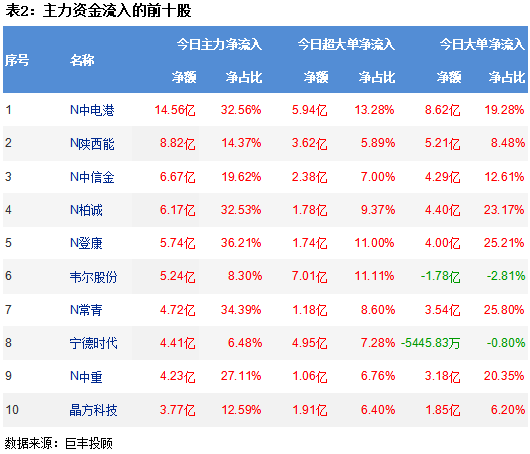 从两市个股主力资金流向来看,N中电港获主力资金净流入14.56亿,N陕西能获主力资金8.82亿净流入,N 中信金获主力资金净流入6.67亿,N柏诚获主力资金净流入6.17亿,N登康获主力资金净流入5.74亿。