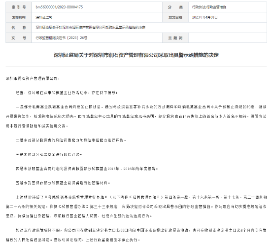 深圳证监局保持活跃的深圳证监局,近期连发三份监管函,直指深圳市润石资产管理有限公司(简称:润石资产)存在五项违规: