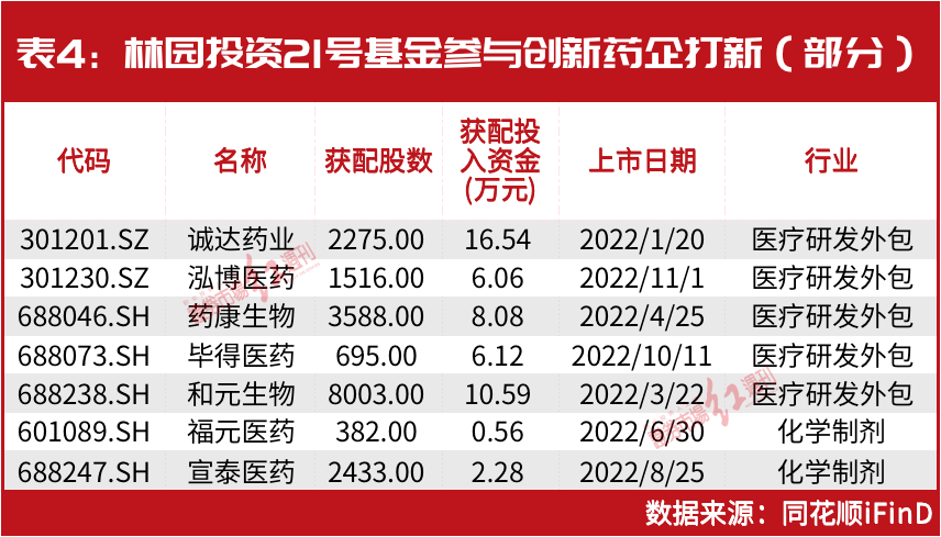 在毕得医药新股首发中,林园多只基金获配其中,如林园投资21号共获配695股,获配投入金额为6.12万元。另外,在创新药领域,林园投资21号此前还参与了诚达药业、泓博医药、药康生物、和元生物、福元医药等多只药企的首发打新(见表4)。