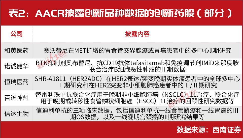 从事件性刺激因素来看,4月中旬,AACR(美国癌症研究协会))大会即将召开。在AACR会议的风口下,具有重磅单品临床数据披露的企业往往会受到资金的密切关注。据西南证券数据显示,目前,超过20家A股与H股创新药企业将在本次AACR会议上披露创新品种的数据,如和黄医药、诺诚健华、百济神州、信达生物等(见表2)。据观察,上述所涉及药企的股价均在近日迎来不俗表现,如诺诚健华,4月4日~4月7日的三个交易日中,累计上涨超过20%;百济神州A股在4月6日~4月7日两个交易日累计上涨达20%。