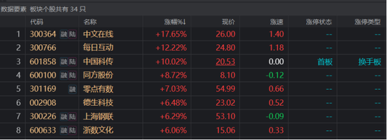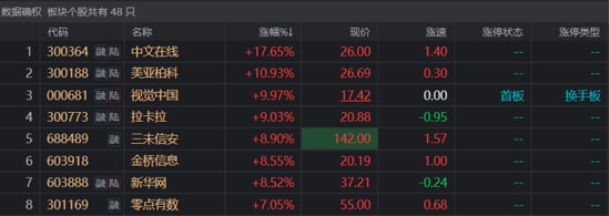 今日(4月11日)早盘,数据产业链相关板块集体冲高,其中,数据要素、数据确权方向涨幅居前。具体个股方面。截止13时30分左右,中国科传、视觉中国双双封板涨停,中文在线大涨近17%,每日互动(维权)、美亚柏科涨幅超10%,同飞股份、拉卡拉、三未信安、金桥信息、新华网等股也涨幅居前。