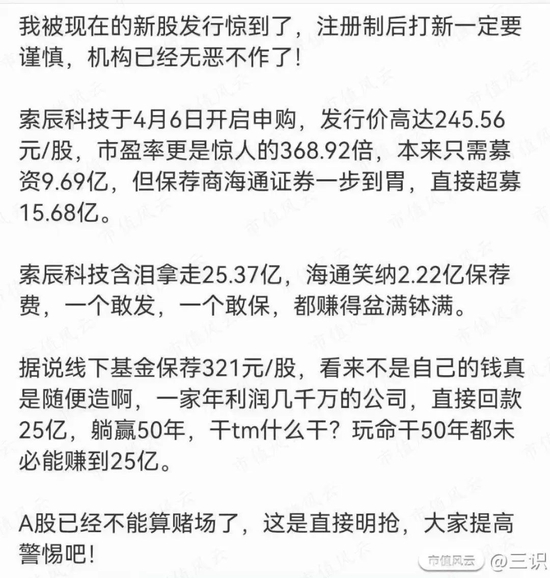 索辰科技发行价为245.56元/股,总股本是4133.34万,对应市值是101.5亿,根据2022年扣非净利润0.27亿,市盈率为369倍。