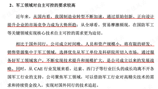 索辰科技的解释是国防军工的自主可控需求更为迫切,同时公司成立时间晚规模小,只能优先从军工单位及科研所切入市场。
