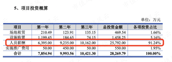 比如补充流动资金项目是培育和引入人才、投入技术和研发,研发中心项目建设最大支出也是人员薪酬。