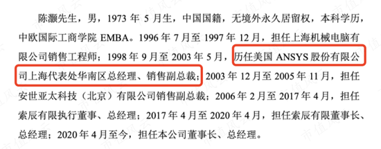 其中,CAE软件是国外企业垄断程度最高的领域,索辰科技的实际控制人陈灏,就是从美国安西斯(ANSYS)出来,曾担任美国ANSYS股份有限公司上海代表处华南区总经理、销售副总裁。