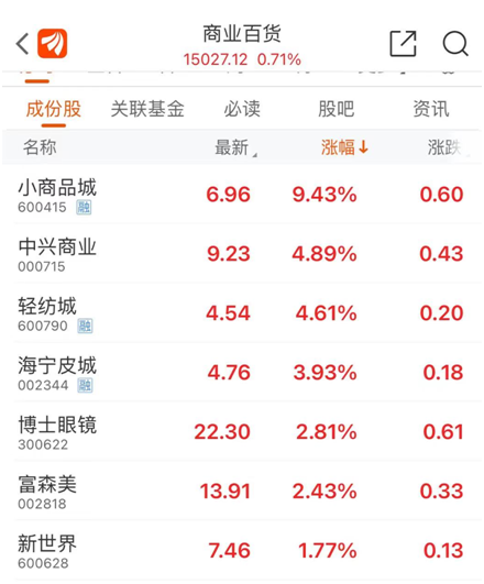 零售股也震荡走强,小商品城涨超9%,中兴商业、大商股份、合肥百货、新世界等跟涨。