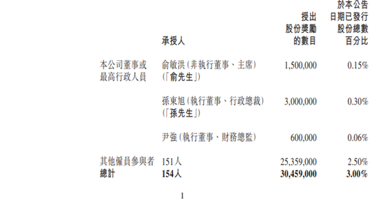 除了这三名高管外,剩下151人获得合计2535.9万股股份激励,价值约7.4亿港元。平均下来,每位参与的员工将获得市值为487万港元的股票,约合人民币427万元。