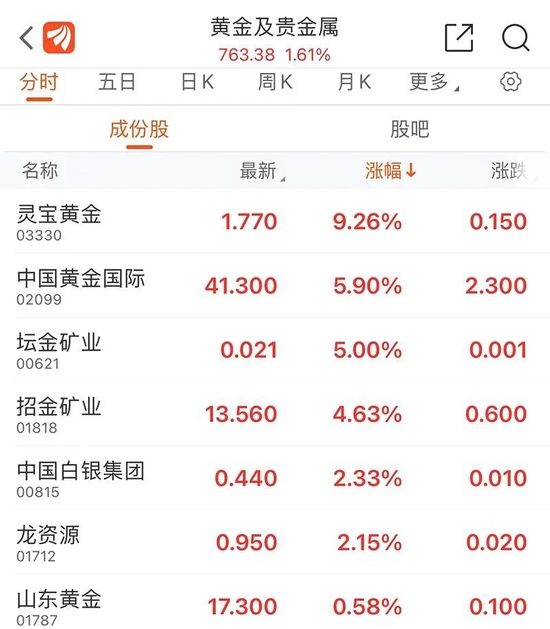 截至发稿,灵宝黄金涨9.26%,中国黄金国际涨5.9%,坛金矿业涨5%,招金矿业涨4.63%。