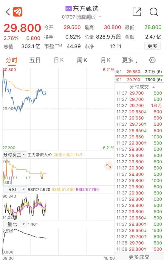 今日早盘,东方甄选股价一度飙升6.21%,截至发稿涨幅回落至2.76%。