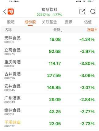 大消费板块则持续走弱,酿酒、食品饮料方向领跌。个股中,贵州茅台盘中股价跌破1700元关口,创出今年以来新低;李子园大跌超5%,天味食品、古井贡酒等跟跌。