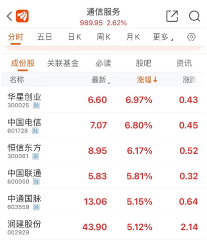 今日早盘,A股三大通信运营商联袂走高,中国电信大涨超6%,中国移动、中国联通均涨超3%。
