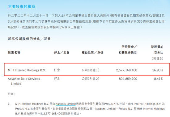 资料显示,Naspers是一家位于南非的跨国上市传媒集团,通过控股的Prosus子公司MIH TC Holdings Limited(简称“MIH”)位居腾讯第一大股东,腾讯年报显示Prosus通过子公司MIH持有腾讯26.93%,为腾讯第一大股东。