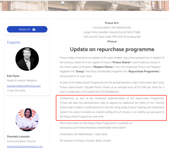 当地时间4月11日,腾讯大股东Prosus在官网宣布更新2022年6月27日宣布的Prosus和Naspers自由流通股股东的开放式回购计划(统称“回购计划”),涉及Prosus和Naspers股本中的N股普通股。