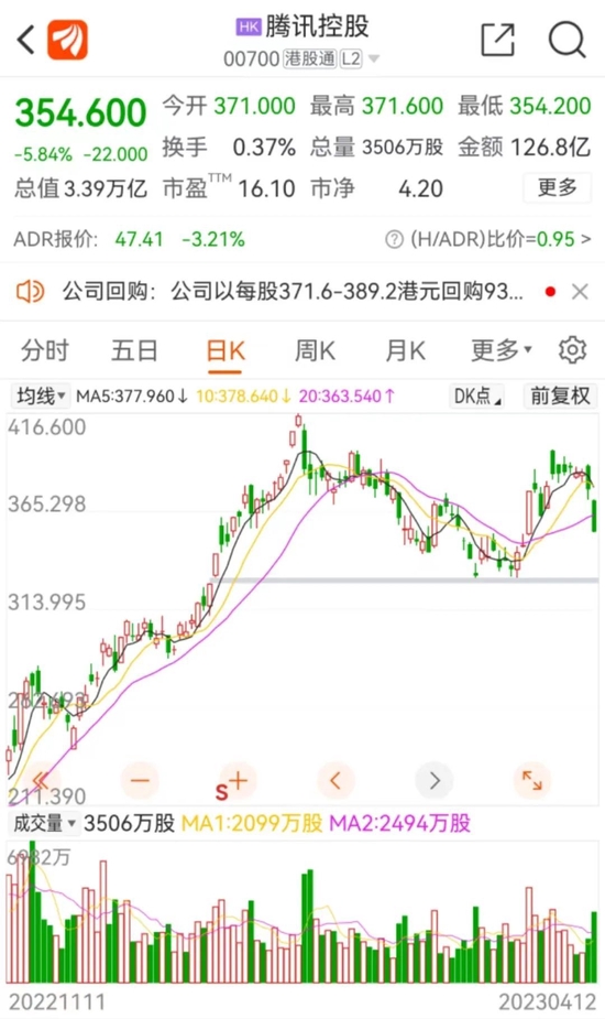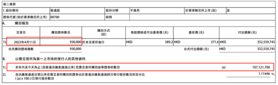 4月11日,腾讯公告,再次出手回购了93万股,斥资3.53亿港元,回购价格在371.6港元/股至389.2港元/股,据统计,今年以来腾讯累计回购了1.07亿股。