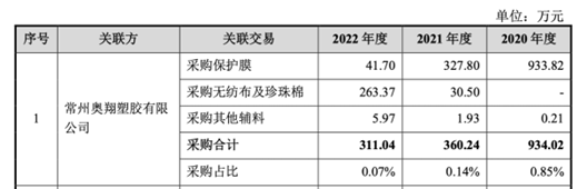 报告期内,永臻股份向常州奥翔塑胶有限公司(下称“常州奥翔”)采购保护膜等产品。2020年-2022年,关联销售金额分别为934.02万元、360.24万元、311.04万元。据招股书,实际控制人邵东芳弟弟邵炳金2019年10月前持有常州奥翔50%股权。