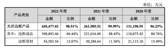 报告期内,公司光伏边框产品业务收入分别为 13.12亿元、26.19亿元、44.55亿元,占同期主营业务收入的比例分别为96.25%、99.99%、98.51%,为营业收入的主要来源。