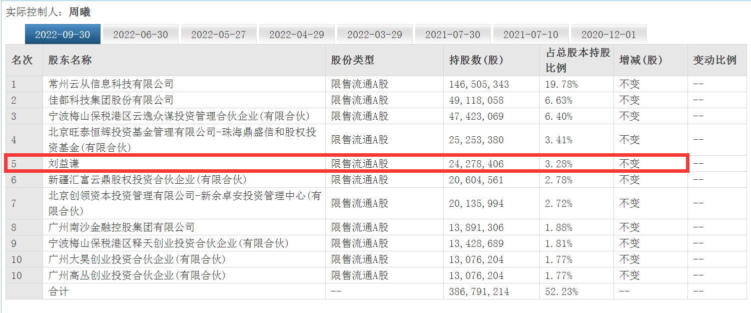今年以来,云从科技股价持续暴涨,最高上涨3倍,最新报46.06元,最新总市值约341.2亿元。据2022年三季报显示,资本大佬刘益谦持有云从科技2428万股,按照最新收盘价算约合11.18亿元。