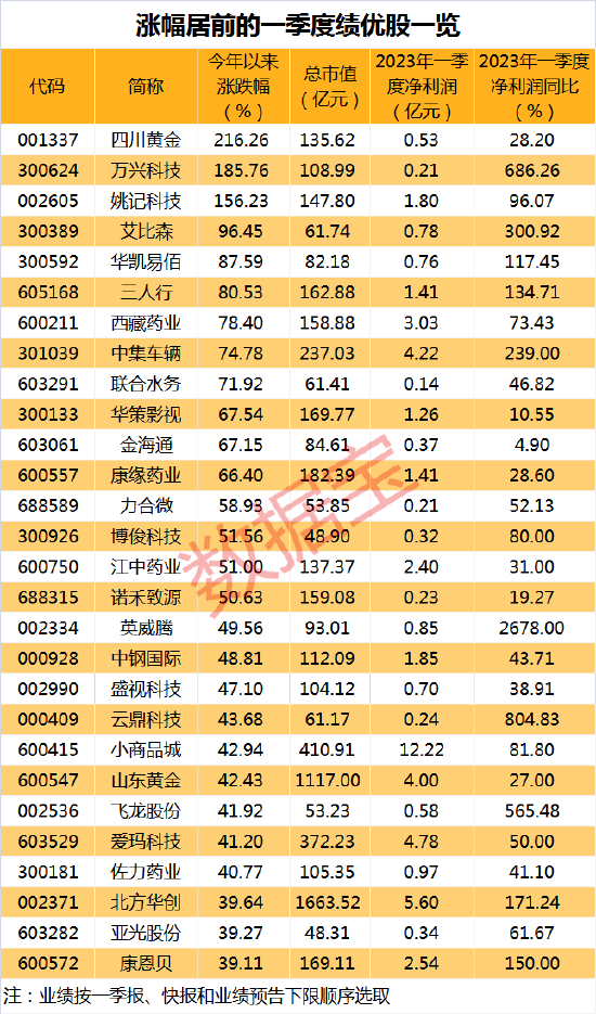 行情表现方面,一季度业绩盈利或业绩预增167家公司中,四川黄金、万兴科技和姚记科技涨幅居前,年内涨幅分别为216.26%、185.76%和156.23%。