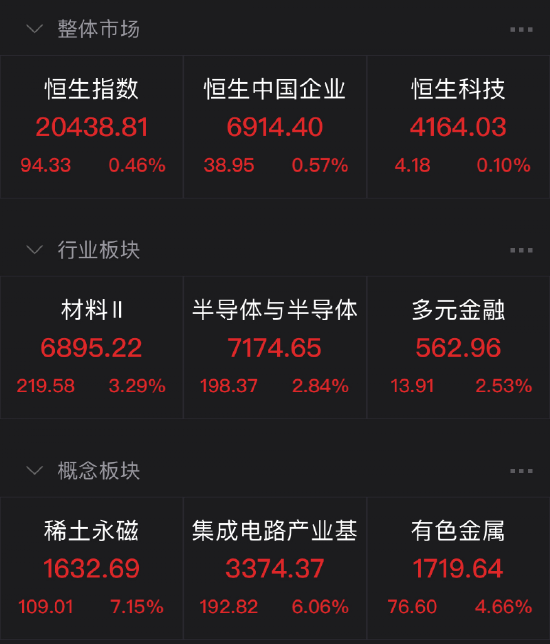 据Wind分类,概念板块方面稀土永磁、集成电路产业基金、有色金属概念涨幅居前。芯片股中芯国际涨潮7%,为升幅最大蓝筹。华虹半导体涨3%。其他科技股方面,阿里巴巴及腾讯各涨0.4%及0.5%。 金属资源股受追捧。五矿资源大涨26.6%,中铝及中国宏桥分别涨6.5%及5.9%。锂业股赣锋锂业及天齐锂业分别涨8.4%及8%。