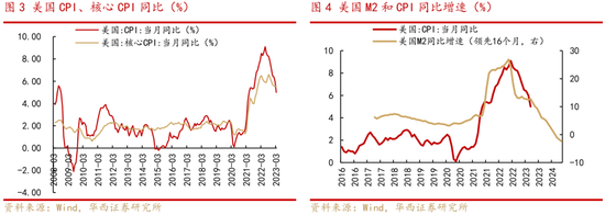 美国的通胀下行趋势已经确立,银行系统风险事件使得美联储加息更快接近尾声。2022年12月,美国M2同比增速转负,今年2月M2增速降至-2.4%,正持续削弱美国通胀的货币基础。根据美国劳工部数据,美国3月CPI同比上涨5%,为2021年5月以来新低;环比上涨0.1%,涨幅较2月收窄0.3个百分点;核心CPI同比增长5.6%,符合市场预期。