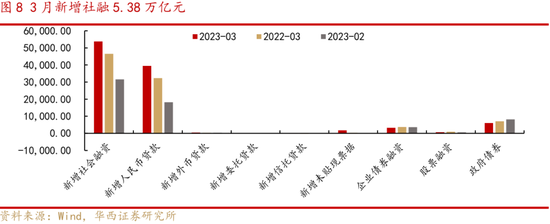 本周央行公布的3月金融数据全面向好,信贷、社融好于预期。信贷方面,3月新增信贷3.89万亿元,高于市场预期的3.09万亿元,同比多增7600亿元;结构上企业端延续较强支撑,居民端明显改善,与地产销售回暖相关的居民中长期贷款3月同比多增2613亿元,与服务消费更相关的居民短期贷款3月同比多增2246亿元。社融方面,3月新增社融5.38万亿元,同比多增7079亿元;结构上主要增量来自人民币贷款,3月社融口径下新增人民币贷款约4万亿元,同比多增7211亿元。