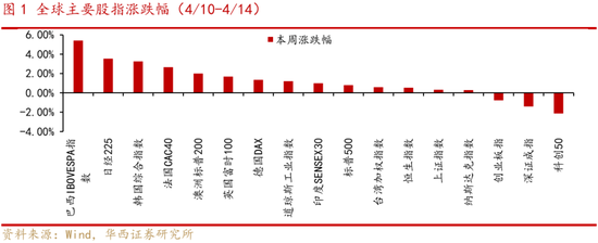 本周全球股指涨多跌少,A股表现弱于全球市场。具体看,本周巴西IBOVESPA指数、日经225和韩国综合指数领涨,涨幅分别为5.41%、3.54%和3.26%;欧洲三大股指法国CAC40、英国富时100和德国DAX指数分别上涨2.66%、1.68%和1.20%;美国三大股指均上涨,道指表现强于纳指;A股方面,科创50、深证成指和创业板指分别下跌2.14%、1.40%和0.77%,板块来看,食品饮料和计算机行业跌幅居前,有色金属、建筑装饰和传媒行业涨幅居前。外汇方面,美元指数连续五周下跌,本周跌至近一年低点,人民币汇率近一个月保持相对平稳。弱美元下大宗商品普遍上涨,WTI原油和ICE布油本周分别上涨2.45%和1.77%,LME铜上涨2.77%。