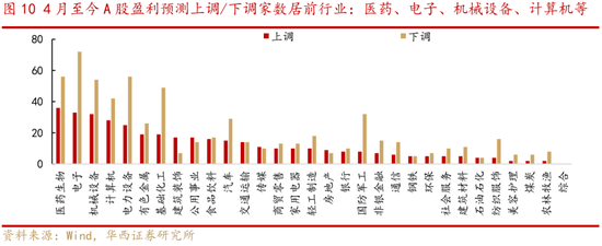 结构上,4月中下旬A股将迎年报/一季报密集披露期,可关注一季报业绩有望高增的行业。根据A股一季报预告和分析师盈利预测调整,医药、机械设备、电子、计算机等细分领域的机会。