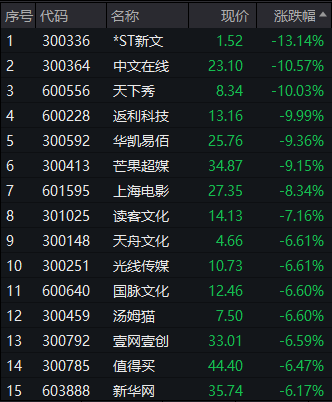 上周连续上演涨停潮的AI应用方向,今日“崩盘”了。文化传媒板块和网络游戏板块均大跌逾3%,中文在线跌逾10%,天下秀、返利科技等跌停,芒果超媒、上海电影等跌逾8%。