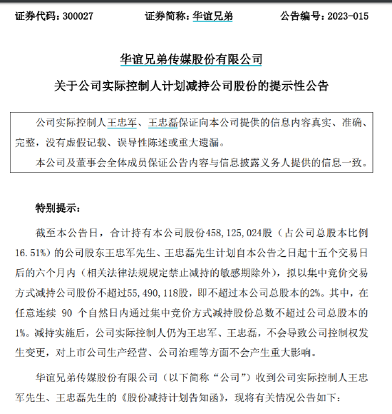 华谊兄弟公告,实际控制人王忠军、王忠磊拟以集中竞价交易方式减持公司股份不超过5549.0118万股,即不超过本公司总股本的2%。