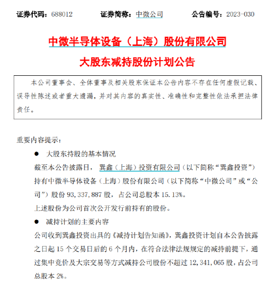 4、中微公司公告,巽鑫投资拟减持不超过2%的公司股份。