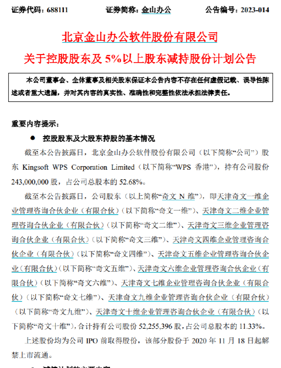 1、金山办公:控股股东及奇文N维拟减持不超过4.735%(按照今天的市值,差不多近100亿)