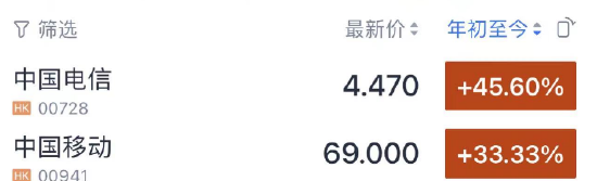 今年以来,在中特估、AI人工智能的驱动下,三大运营商股价大涨,其中电信、移动港股分别涨超45%、33%!