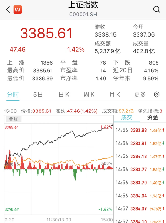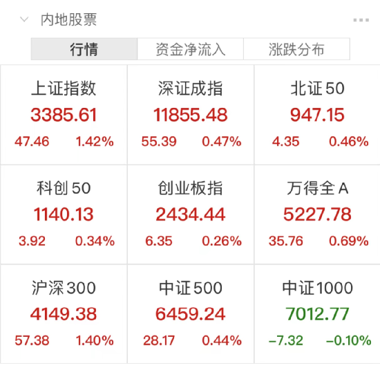 今日,A股三大指数集体上涨。截至收盘,上证指数报3385.61点,上涨1.42%;深证成指报11855.48点,上涨0.47%;创业板指报2434.44点,上涨0.26%;科创50指数报1140.13点,上涨0.34%。