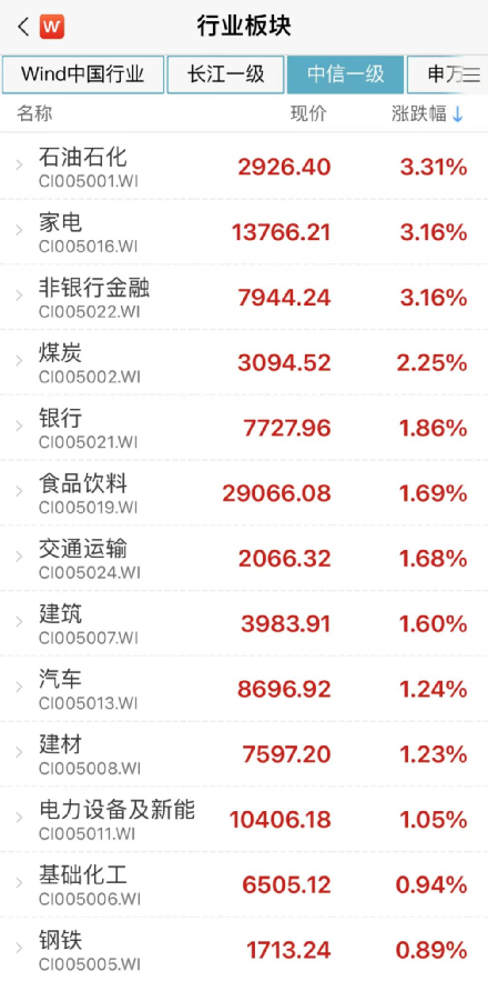 中信一级行业中,大部分行业上涨,其中,石油石化、非银行金融、家电涨幅靠前,分别上涨3.31%、3.16%、3.16%;通信、计算机、传媒跌幅靠前,分别下跌1.00%、1.46%、3.79%。2753只个股上涨,2183只个股下跌。