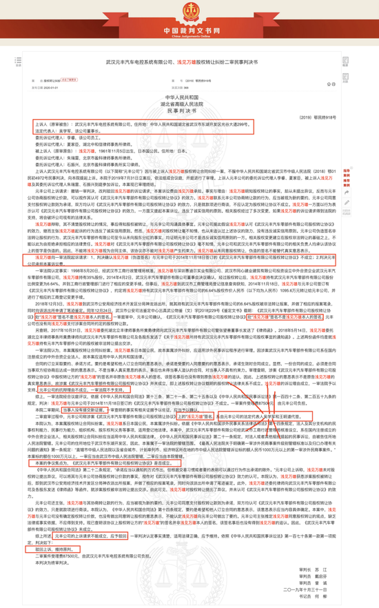 裁判文书网,案号(2018)鄂01民初4972号显示,《浅见万雄与武汉元丰汽车电控系统有限公司股权转让纠纷一审民事判决书》,截取部分判决书内容详情请浏览上述案号。