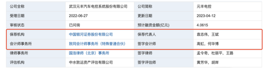 丰源电控保荐机构为中国银河证券股份有限公司(以下简称“银河证券”)保荐代表人袁志伟,王斌。会计师事务所为致同会计师事务所(特殊普通合伙)签字会计师 高虹,何华博。