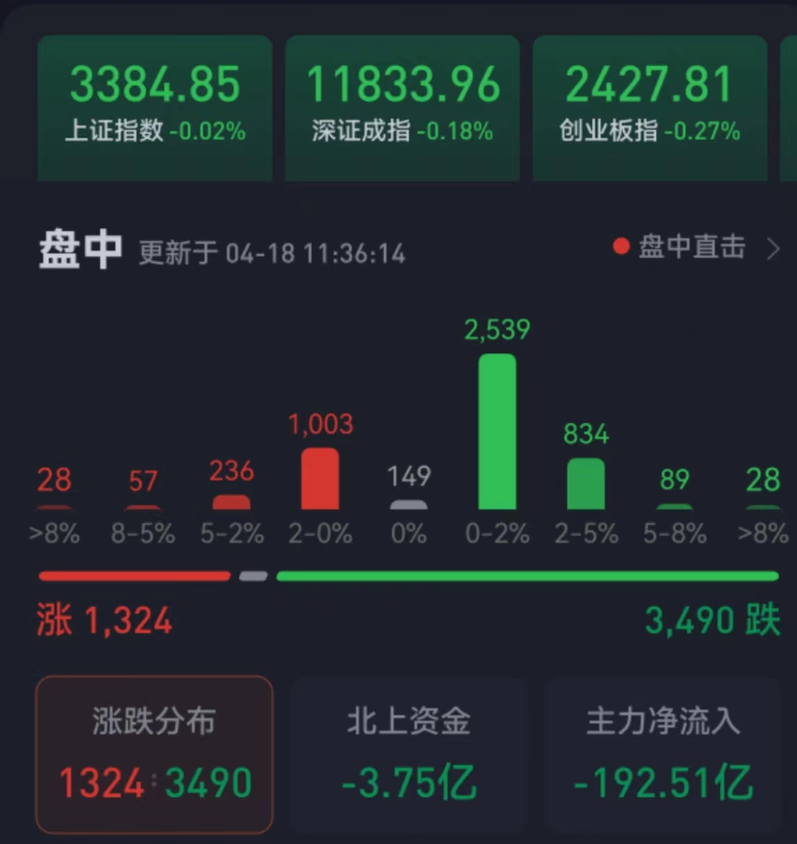 周二(4月18日),三大股指继续震荡整理。截至上午收盘,上证指数跌幅达0.02%,报3384.85点;深证成指和创业板指跌幅分别为0.18%和0.27%;沪深两市合计成交额6672.9亿元,总体来看,两市个股跌多涨少。????