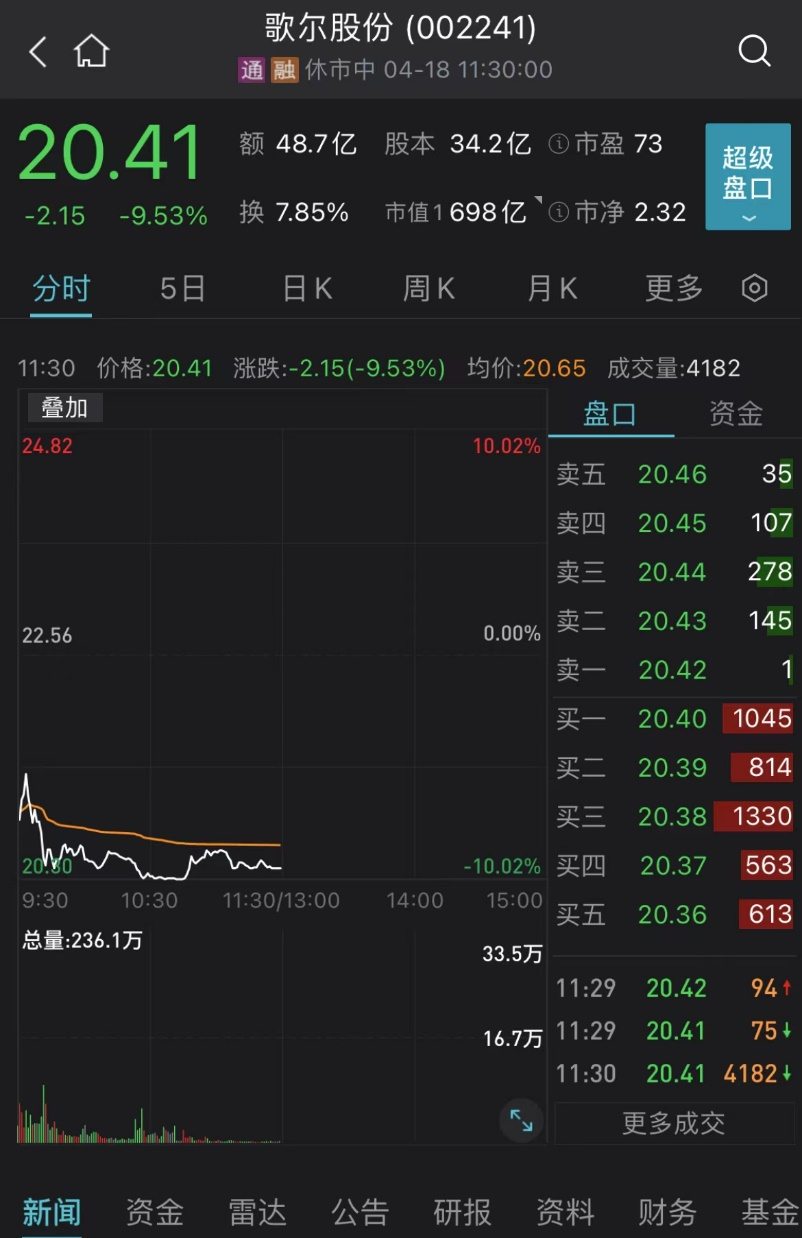 今天上午,歌尔股份下跌9.53%,盘中触及跌停。