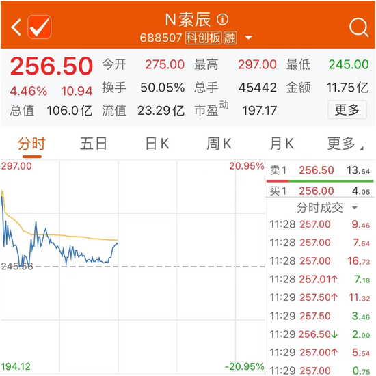 今日,备受市场关注的“年内最贵新股”索辰科技(下称“N索辰”)登陆科创板,发行价245.56元/股,早盘高开近12%,随后涨幅缩窄,盘中一度破发。截至午间收盘,N索辰报256.50元/股,上涨4.46%,换手率达50.06%,成交额为11.7亿元。