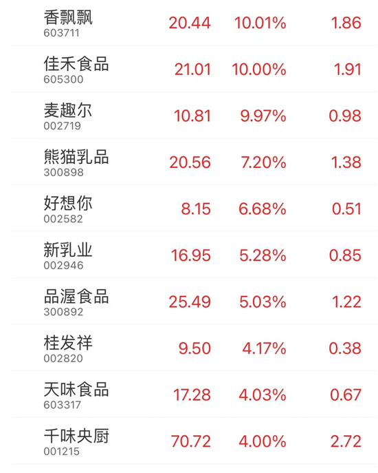 受最新经济数据超预期的提振,食品饮料板块早盘迎来大爆发。截至午间收盘,香飘飘、佳禾食品、麦趣尔涨停,熊猫乳品、新乳业、好想你、品渥食品等涨幅居前。
